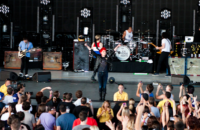 Earlier, openers My Chemical Romance delivered their own version of the sonic fountain of youth. With drummer Mike Pedicone (The Bled) and keyboardist/percussionist James Dewees (Coalesce, The Get Up Kids) bolstering the core lineup, MCR spent the first half of their hour-long set playing songs from their latest LP, Danger Days. Among them was the new-wave techno rocker «Planetary (GO!),» which a fluorescent pink-haired Way introduced by challenging the crowd to a dance contest—and when multi-colored balloons engulfed the stage, it really did feel like you were at futuristic rave instead of a New Jersey rock show.